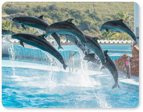 イルカたちのダイナミックな「ハイジャンプ」や直径1mの特大ビーチボールを客席に向かって尾びれでキックする「ビーチボールキック」、カリフォルニアアシカの愛嬌たっぷりなパフォーマンスを披露。前方の席は水しぶきもかかることも…!